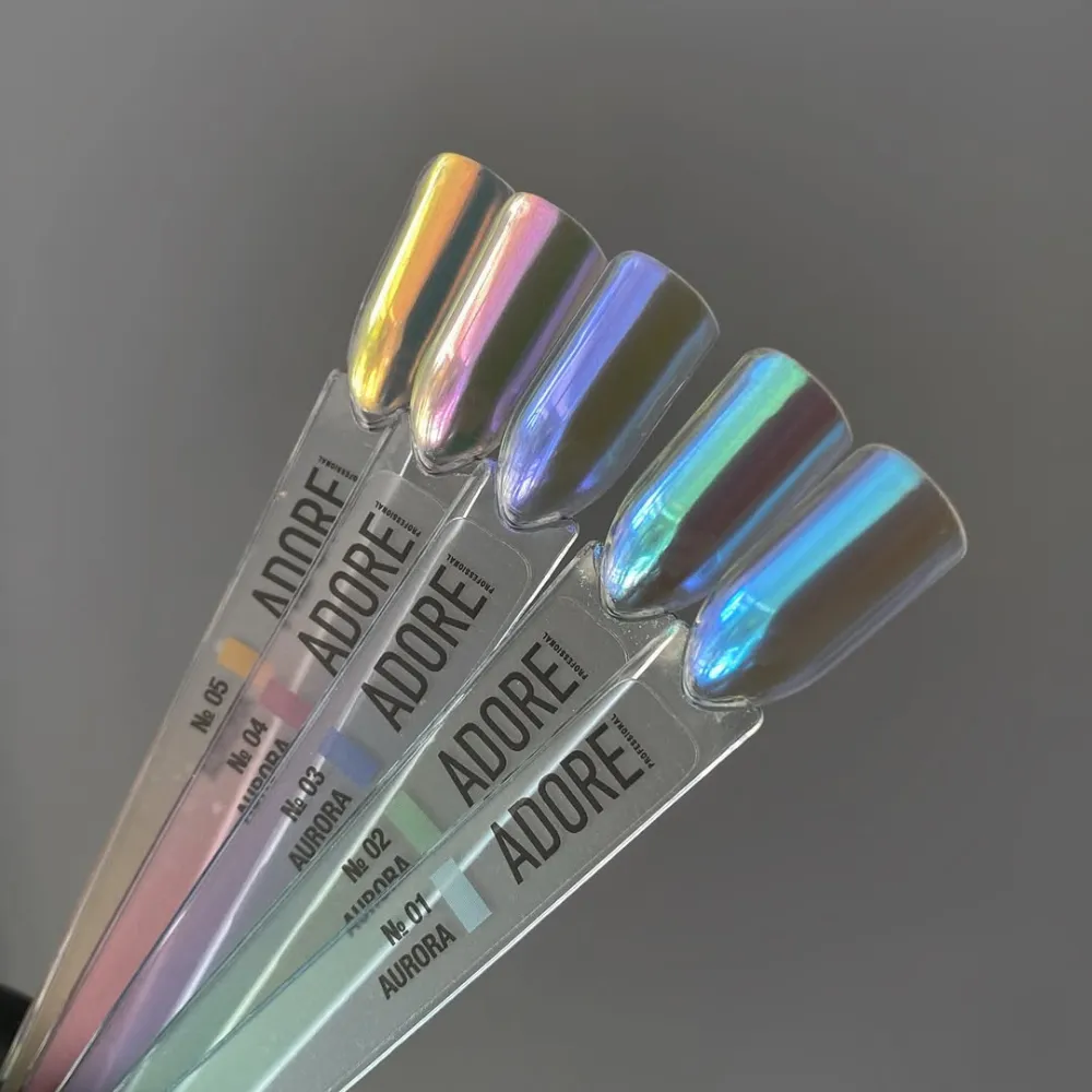 Aurora Powder — прозора пудра-хамелеон тонкого помелу, що відтворює на нігтях переливи полярного сяйва. Колір прозорої втирки-хамелеон Aurora Powder №01- золотисто-блакитна; Кожен відтінок колекції надає манікюру грайливий ультраглянцевий блиск, що динамічно змінюється в залежності від кута освітлення: на прозорій та Втирка підходить для створення ефекту мокрих нігтів, glazed look, rainbow nails, а також акваріумного ефекту у 3D дизайнах. Спосіб нанесення втирки: Втирка-хамелеон для нігтів Aurora Powder ADOREВтирка-хамелеон для нігтів Aurora Powder ADORE