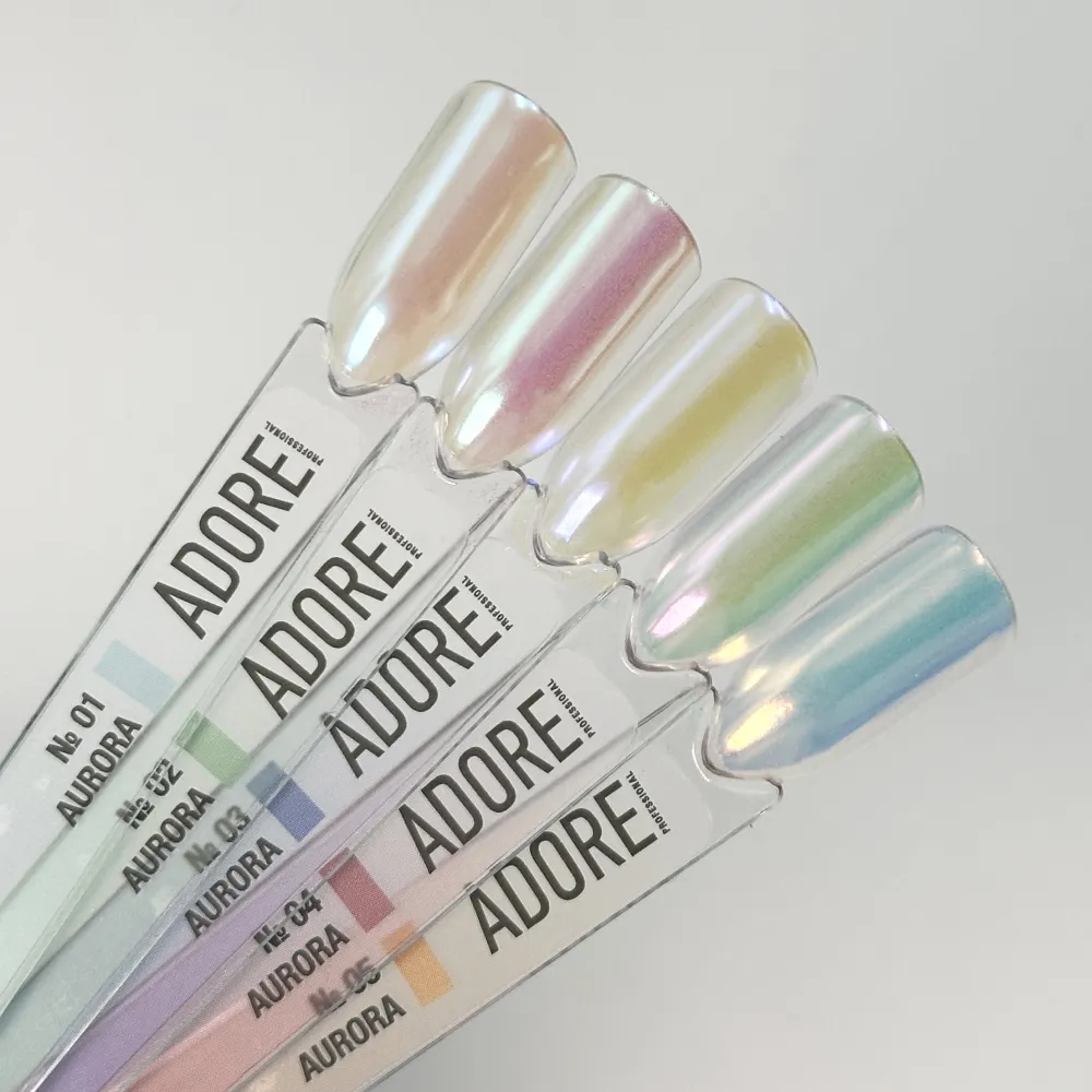 Aurora Powder — прозора пудра-хамелеон тонкого помелу, що відтворює на нігтях переливи полярного сяйва. Колір прозорої втирки-хамелеон Aurora Powder №02- рожево-зелений; Кожен відтінок колекції надає манікюру грайливий ультраглянцевий блиск, що динамічно змінюється в залежності від кута освітлення: на прозорій та Втирка підходить для створення ефекту мокрих нігтів, glazed look, rainbow nails, а також акваріумного ефекту у 3D дизайнах. Спосіб нанесення втирки: Втирка-хамелеон для нігтів Aurora Powder ADOREВтирка-хамелеон для нігтів Aurora Powder ADORE