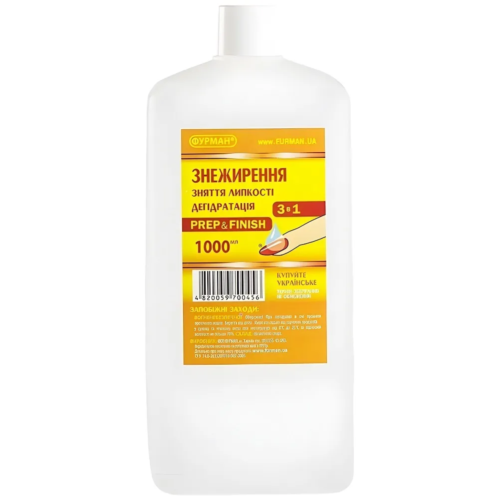 Засіб 3 в 1 Prep&Finish допоможе підготувати нігтьові пластини до нанесення базового шару гель-лаку та зняти липкість після полімеризації під ультрафіолетовим апаратом. Рідина добре прибере жир, воду та забруднення з нігтя і допоможе позбутися дисперсійного шару, коли манікюр чи педикюр вже закінчено. Особливості продукту: Засіб для знежирення і зняття липкості, дегідратації 3 в 1, 1000 мл Prep&Finish ФУРМАН Застосування: Засіб для знежирення і зняття липкості, дегідратації 3 в 1, 1000 мл Prep&Finish ФУРМАН Рухайтеся від кутикули до краю.Засіб для знежирення і зняття липкості, дегідратації 3 в 1 Prep&Finish ФУРМАН