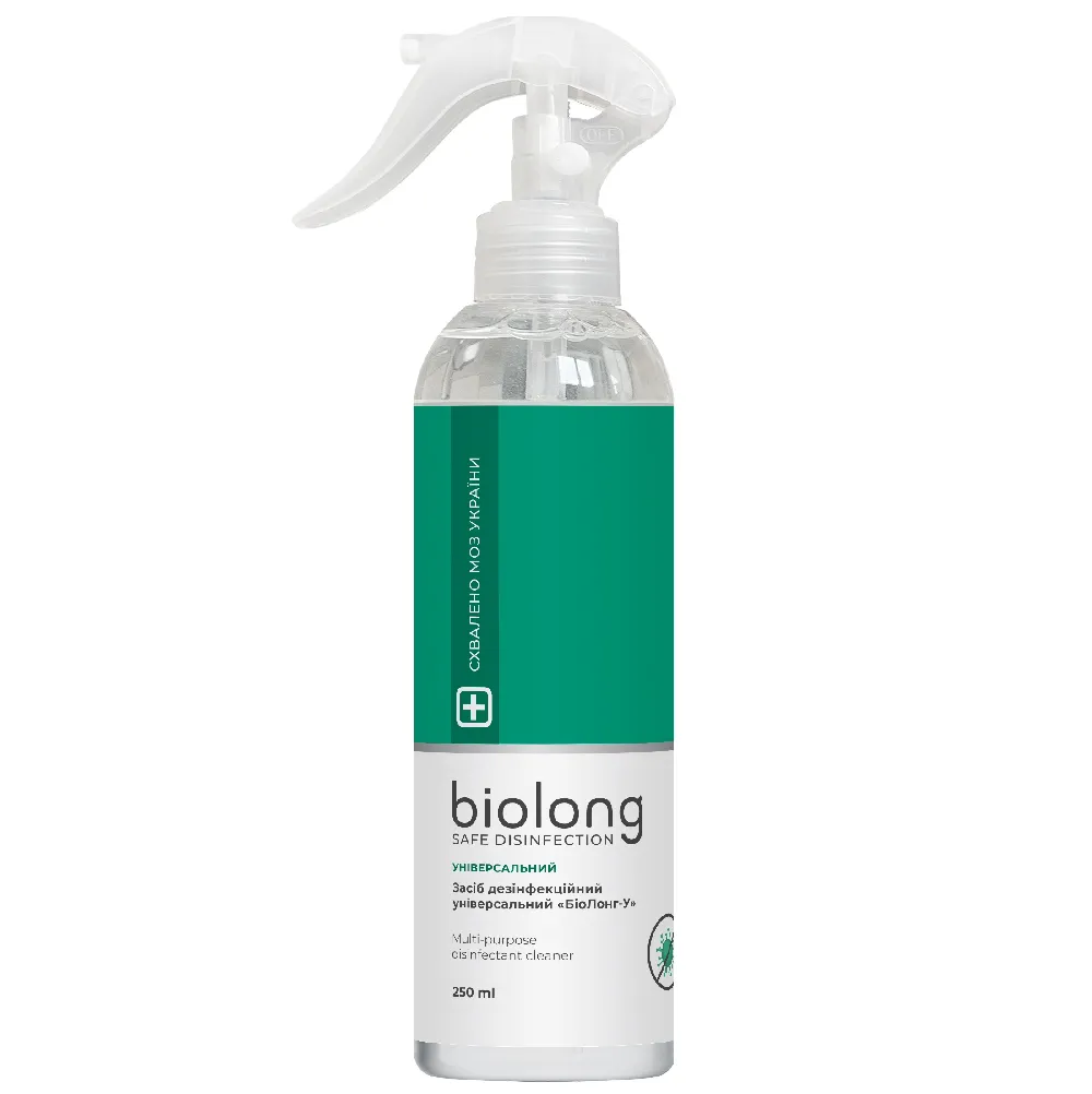 БіоЛонг Універсальний — препарат для дезінфекції предметів та поверхонь: інструментів, обладнання, одягу, взуття, меблів. Препаративна форма: рідина. Засіб готовий до застосування. Ефективний щодо грамнегативних та грампозитивних бактерій, у тому числі, мікобактерій туберкульозу, поліовірусу, грибів роду Призначення засобу "БіоЛонг універсальний" — проведення дезінфекції на об`єктах, що підлягають санітарному контролю: Спосіб застосування дезінфектанту «БіоЛонг універсальний»: Переваги препарату «БіоЛонг універсальний»: Запобіжні заходи: Термін придатності — 3 роки. Зберігати в сухому місці при температурі 4-30°С БіоЛонг Універсальний