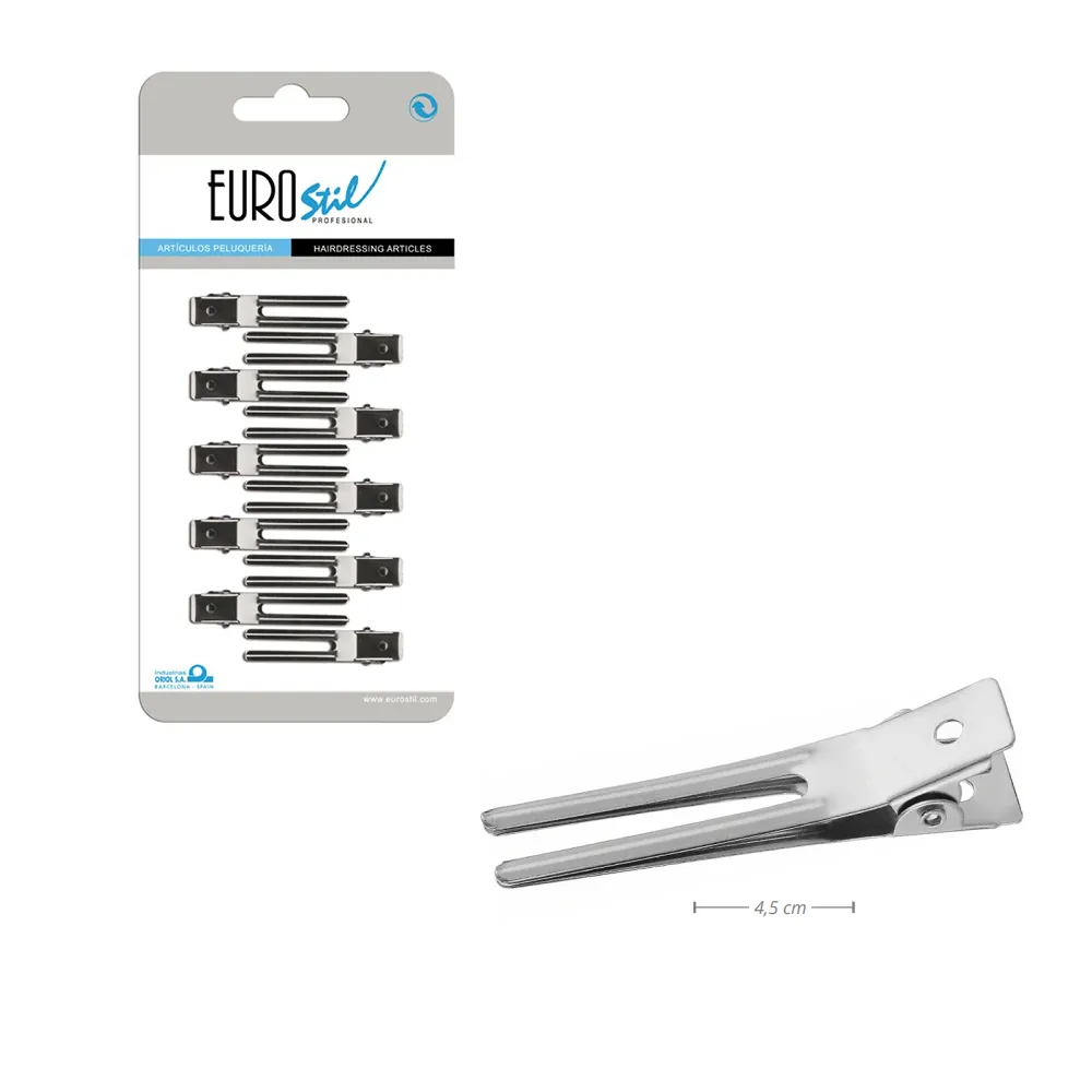 Затискач для волосся металевий подвійний від іспанського бренду Eurostil - це професійний аксесуар, що використовується для фіксації пасом волосся під час стрижки, укладання чи фарбування. Особливості продукту: Затискач для волосся металевий подвiйний (1 шт) 00094 Eurostil Розмір: 4,5 см. Затискач для волосся металевий подвiйний (1 шт) 00094 Eurostil
