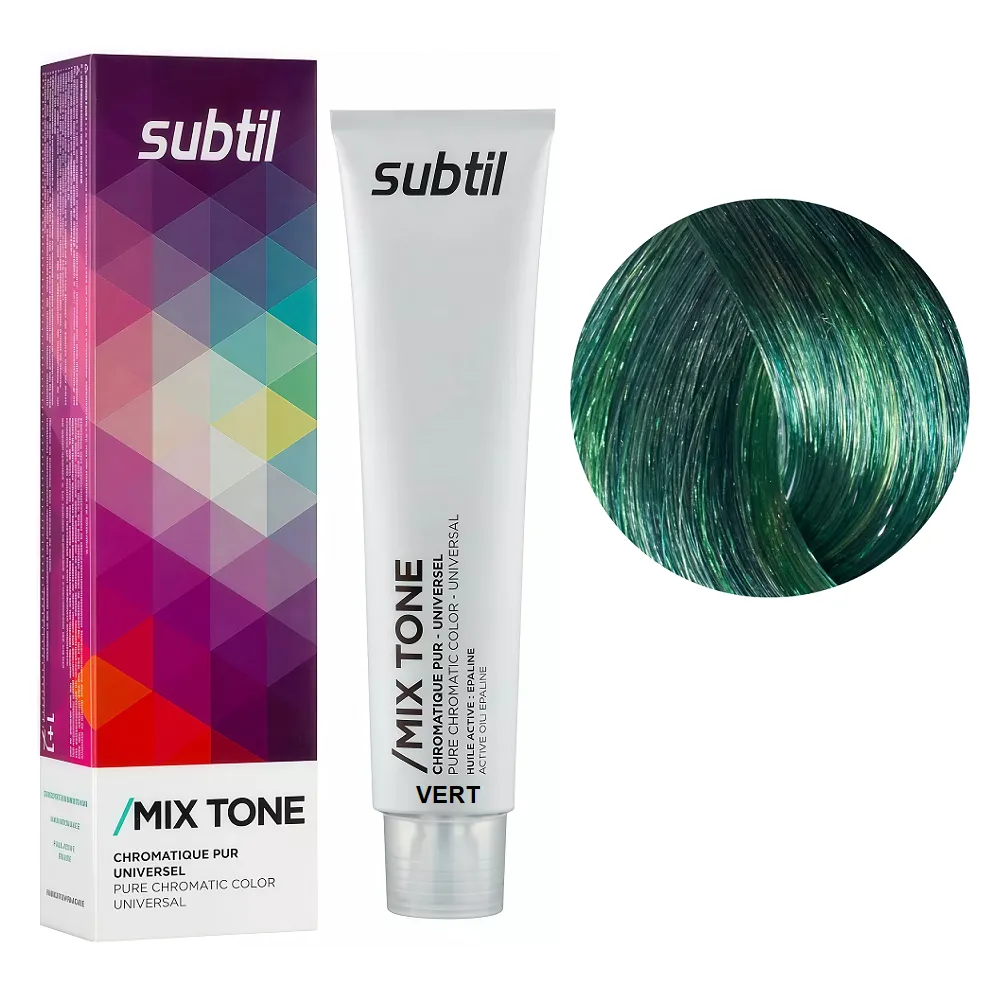 Subtil MIX TONE - стійка крем-фарба, концентрат фарбувальних речовин без аміаку, яка надає насичений відтінок, здорове волосся, сяючий блиск та розкішний вигляд! В асортименті MIX TONE вісім основних відтінків (фіолетовий, синій, маджента, жовтий, помаранчевий, перламутровий, зелений, графіт) MIX TONE виконують три основні функції: створення відтінку при прямому фарбуванні, посилення кольору та нейтралізація небажаних відтінків. Рекомендується застосовувати з усіма лінійками барвників SUBTIL Ducastel - тому фарба підходить для універсального використання при всіх техніках фарбування. Покриває волосся спеціальною плівкою, глибоко зволожує їх зсередини і живить структуру волосся, не обтяжує, додає блиск, еластичність, вже після першого використання. Також запобігає посіченість кінчиків і відновлює волосся під час фарбування. Застосування: Зелений (VERT) Стійка крем-фарба без аміаку, 60 мл MIX TONE SUBTIL 2. Посилення кольору та нейтралізація небажаних відтінків: MIX TONE використовують в суміші з усіма лініями барвників SUBTIL з окислювачами Subtil Oxidant 3%, 6%, 9%, 12% або 2,7% в пропорції від 1 + 1 до 1 + 3 в залежності від фарбувальної суміші, яка використовується: Застосовувати фарбу слід, суворо дотримуючись інструкції, яка додається до кожної упаковки.Стійка крем-фарба без аміаку MIX TONE SUBTIL